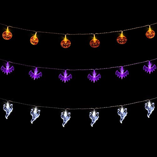 Set di 3 luci di Stringa di Halloween, 3M 20 LED Zucche Arancioni, Pipistrelli Viola, lancette a Scheletro Bianche Luci a Batteria alimentate a Batteria per Decorazioni di Halloween