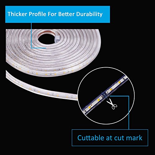 Le luci della striscia di 220-240V AC DIFFERENZA CON LA LUCE DI STRUTTURA DI 12V LED: 240V è alta luminosità e flessibile, può collegarsi direttamente alla presa di potenza della famiglia. Profilo più denso con tubo in PVC trasparente per una migliore durata. Max Run è 300-328ft. Spina fusa di sicurezza per protezione di sovracorrente.