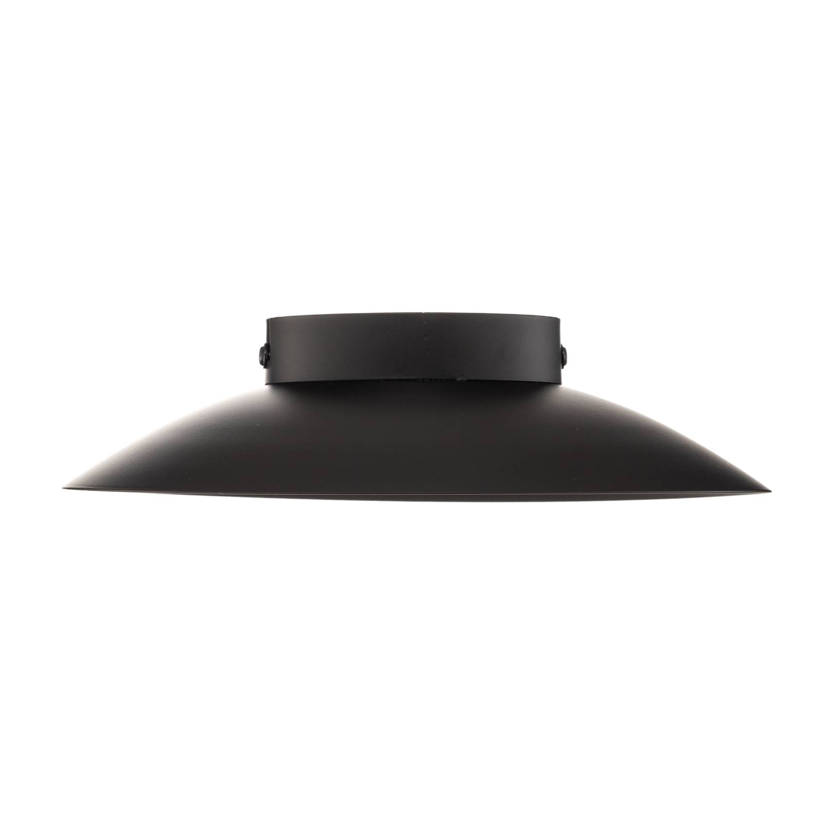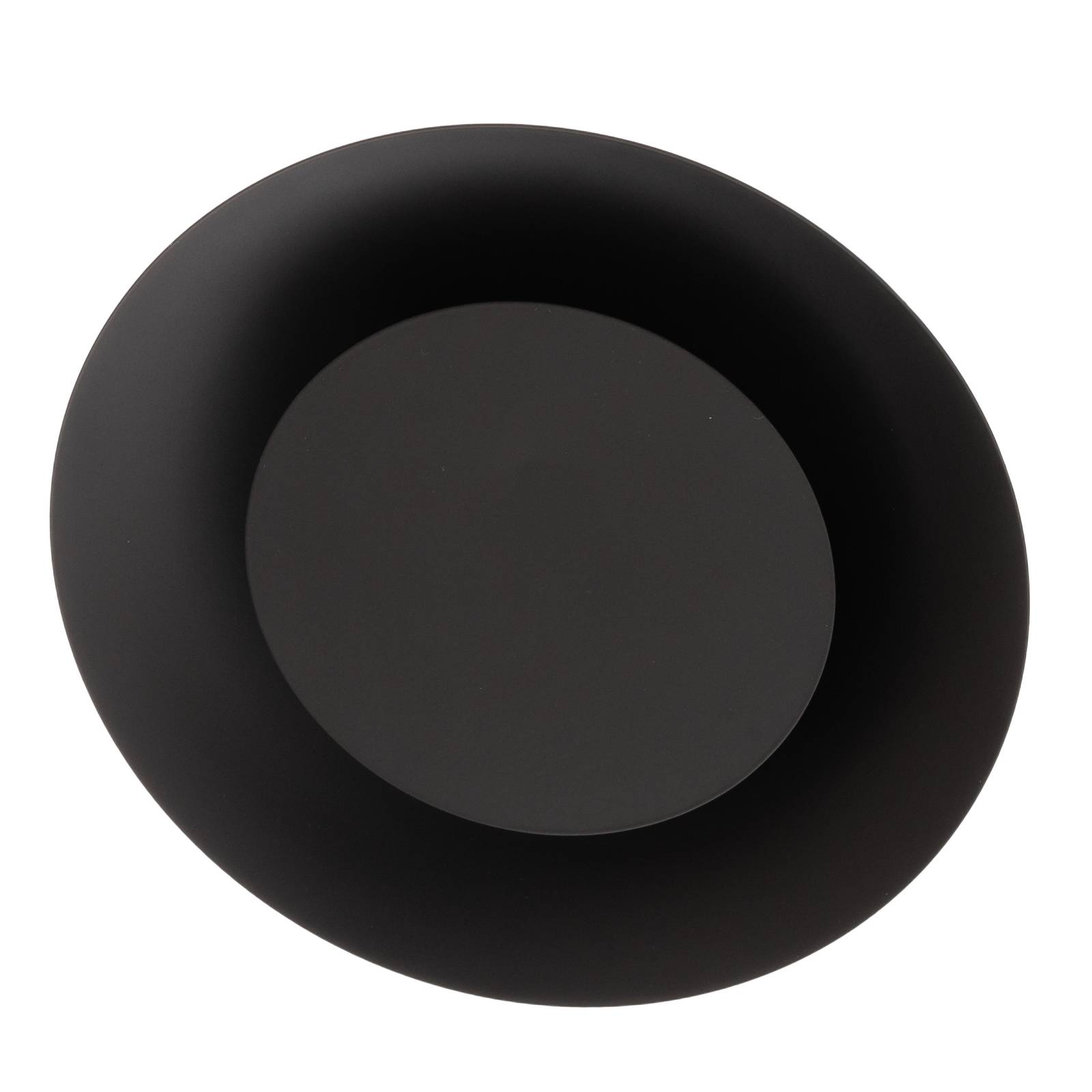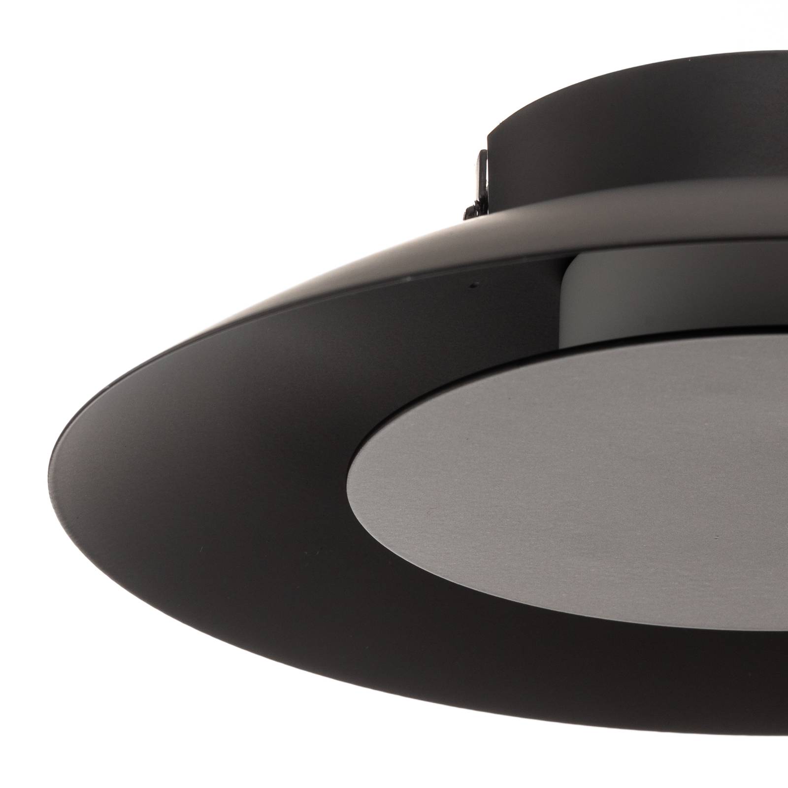 Plafoniera a LED Foskal - nera con radiazione di luce indiretta L'apparecchio da soffitto a LED Foskal è moderno nel design e ha un bellissimo effetto di illuminazione indiretta. E' completamente realizzato in metallo verniciato nero opaco ed è dotato di LED bianchi caldi. Questi sono stati installati dietro la piastra metallica diritta e rotonda al centro della piastra curva del soffitto, in modo che la loro luce si irradi verso l'alto nel guscio del soffitto. Questo crea un effetto di luce indiretta molto confortevole nella stanza. Il design nero rende l'apparecchio la sorgente luminosa ideale per molti ambienti dal design moderno.