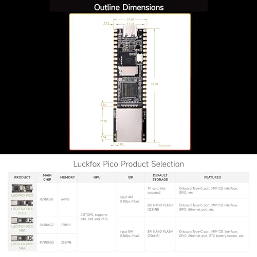 [Powerful Processing Capability] LUCKFOX Pico Plus(with Ethernet Port) is equipped with a highly integrated IPC vision processor SoC, RV1103 chip, featuring a single-core ARM Cortex-A7 32-bit core with integrated NEON and FPU. With a built-in NPU supporting INT4/INT8/INT16 mixed operations, it delivers a remarkable computing power of up to 0.5TOPs