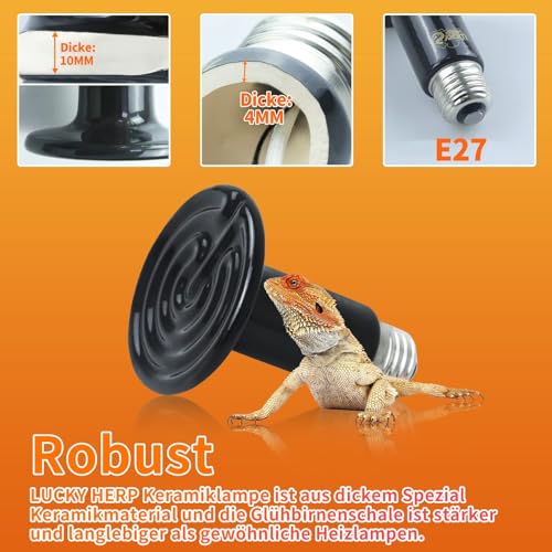 Robusto: il riscaldatore per rettili LUCKY HERP è realizzato in materiale ceramico speciale e spesso e il guscio della lampada riscaldante è più resistente e durevole rispetto alle normali lampade riscaldanti. Le nostre lampade per rettili durano fino a 10.000 ore. Utilizzare con base lampada E27 standard, 220 volt e facile da installare.
