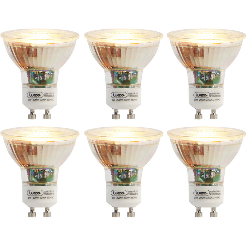 LUEDD Set di 6 lampade LED GU10 3W 200 lm 2200K Cerchi un bel set di 6 lampadine GU10 per i tuoi faretti o lampade da parete? Allora queste lampadine sono quello che fa per te! Ogni lampadina ha un diametro di 5 cm e un'altezza di 5,5 cm. La lampadina utilizza 3 watt e ha un'emissione luminosa di 200 lumen e 2.200 Kelvin. Perfetta per l'uso in soggiorno, camera da letto o sala da pranzo! Funzioni extra: Non regolabile Lampadine inclusiva Il LUEDD Set di 6 lampade LED GU10 3W 200 lm 2200K è Trasparente. Gli spazi abitativi adatti per questa lampada sono: . Termina l'aspetto dei tuoi interni con questo Set di 6 lampade LED GU10 3W 200 lm 2200K! QAZQA è un marchio che rende l'unicità accessibile. Sappiamo che l'interior design è reso speciale da singoli oggetti di design che completano elegantemente un'installazione e completano il design generale. Progetta oggetti che si distinguono da soli e si integrano perfettamente. Siamo diversi? Un pochino Qualunque stile tu preferisca, QAZQA ti