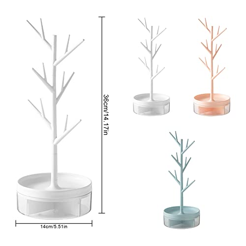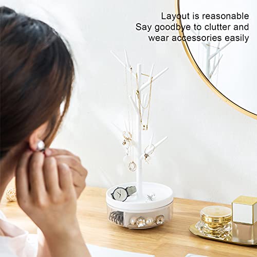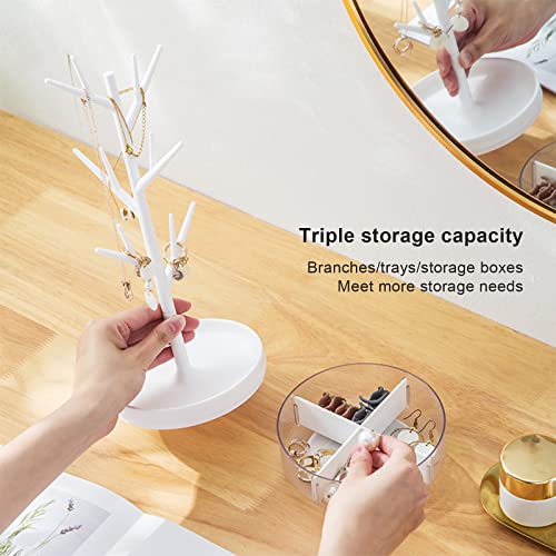 Organizer per albero dei gioielli con scatola di immagazzinaggio di base: questo supporto per gioielli ha un vassoio e una scatola portaoggetti nella parte inferiore, puoi mettere orologi, rossetti, piccoli gioielli sul vassoio, orecchini, piccoli fermagli per capelli, orecchini e altri gioielli nella scatola nella parte inferiore per evitare perdite.