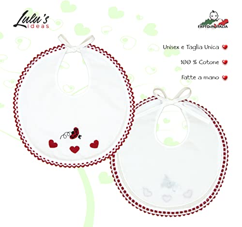 Lulu's Ideas Bavaglino Neonato, 100% Cotone Bianco con Ricamo Rosso, Chiusura con Laccetti, Prodotto di Alta Qualità, Realizzato a Mano in Italia