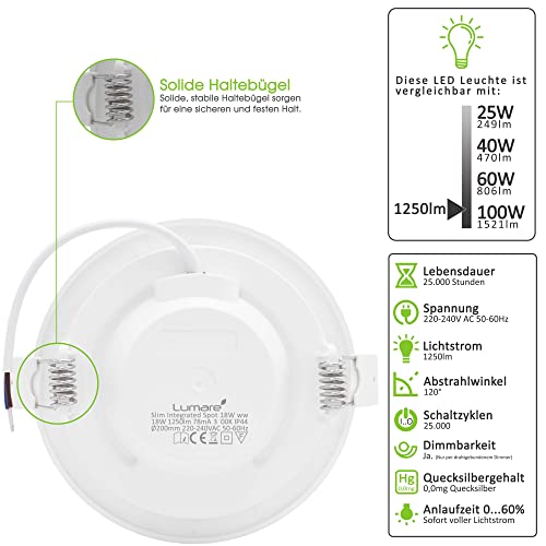 Lumare faretto da incasso dimmerabile 18W extra piatto IP44 1250lm Ø220mm | faretto da incasso in bianco solo 26mm profondità d'incasso, 200mm Ø d'incasso spot a soffitto 230V