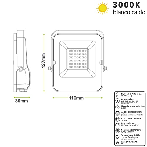 Lumare Faretto LED 30W | Proiettore Extra Piatto | IP65 Impermeabile | 3000K Bianco Caldo | Per Faretti da Esterno e Interno