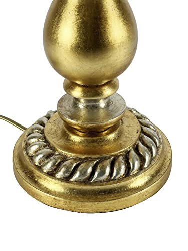 STRUTTURA INTERAMENTE IN LEGNO LAVORATA A MANO COLORE FOGLIA ORO CON PARTICOLARI FOGLIA ARGENTO. PARALUME IN TESSUTO AVORIO CON CORDONCINO ORO