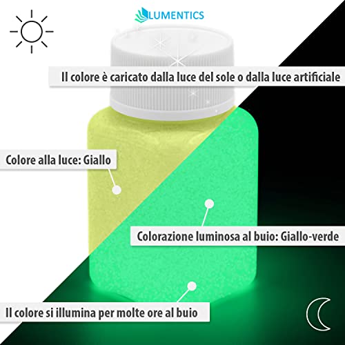 LUMENTICS Qualità: colore che si illumina al buio con una luminosità lunga. 100 g (circa 90 ml) di colore autoilluminante in pratica bottiglia richiudibile. Colore acceso direttamente applicabile. Ricaricabile e fosforescente.