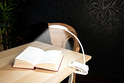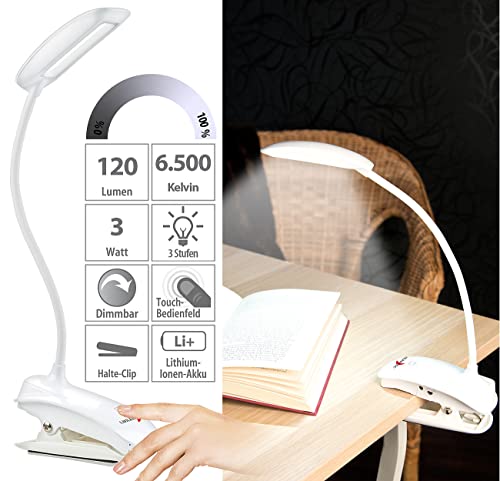 Lampada da tavolo a LED con cavo di ricarica USB e istruzioni in tedesco/francese/spagnolo/italiano. Lampada da lettura libro - Anche rilevante o appropriato per: Lampada a morsetto batteria, Lavoro leggero, scrivania, senza fili, Lampada da ufficio, tastiera, letto