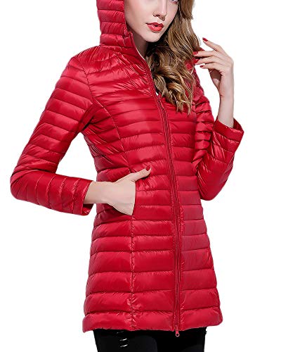 Lunga Giacche Piumino Donna Ultraleggeri Cappotto Trapuntato Packable Giacca con Cappuccio Rosso M