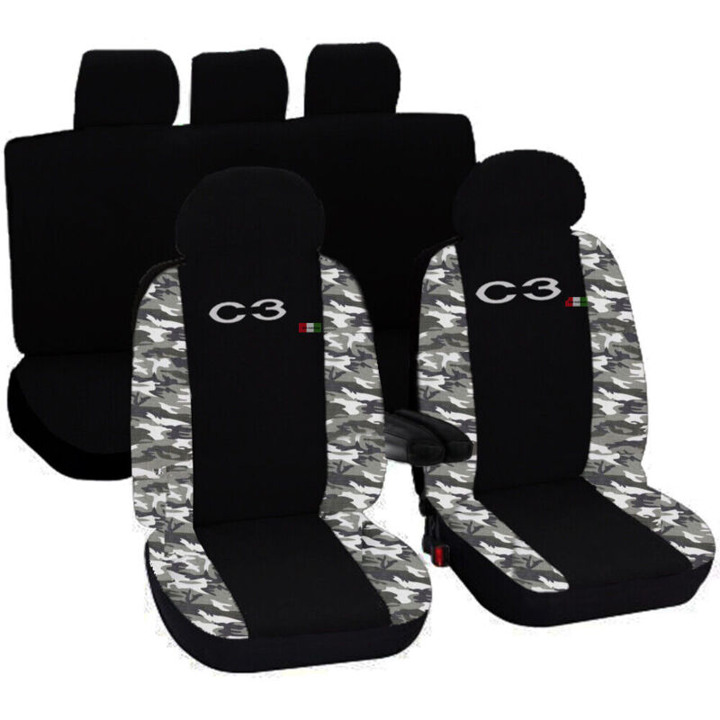 Coprisedili auto compatibili per C3, con schienale posteriore diviso per la versione 60e40 e seduta intera. Fodere anteriori compatibili con airbag laterale Come sono fatti: Realizzati in tessuto misto poliestere con tessuto elasticizzato nella parte posteriore della fodera. Nome Logo Ricamato. Lavorazione prodotto interamente italiana Dove lo posso montare: Le fodere sono compatibili per C3 ad esclusione della versione Picasso e DS8 Cosa ricevo a casa? Un set Completo composto da 12 pezzi: 4 Coprisedili anteriori (lato guida 2pz + lato passeggero 2pz), 2 Copri Braccioli, 3 Coprisedili posteriori (Schienale 2pz + seduta), 5 Copri Poggiatesta. Set Ganci incluso A cosa serve: Utile per non macchiare e/o danneggiare i sedili della tua auto e per personalizzare gli interni della tua auto migliorandone l'aspetto. Si prega di evitare di usare violenza durante il montaggio, in quanto gli elastici potrebbero strapparsi se la tensione è troppo alta