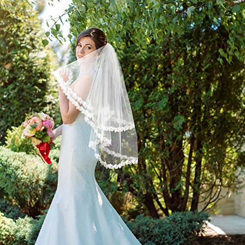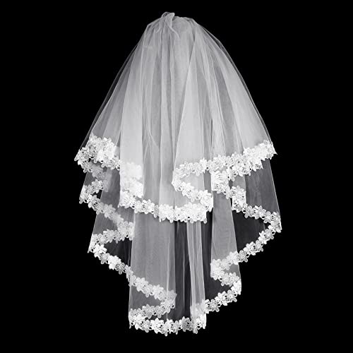 Lurrose - Velo da sposa corto a 2 strati, in pizzo, da donna, tulle con pettine, per matrimonio, lunghezza di 90 cm, colore bianco, bianco, M