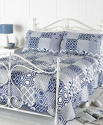 Set 3pz lusso, copriletto trapuntato patchwork vintage in stile country con 2 federe per matrimoniale King Blue Navy Grey