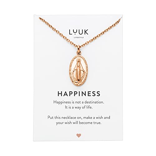 LUUK LIFESTYLE Catenina in acciaio inossidabile con pendente Vergine Maria e biglietto dedica HAPPINESS, portafortuna, catenina regolabile, rosa