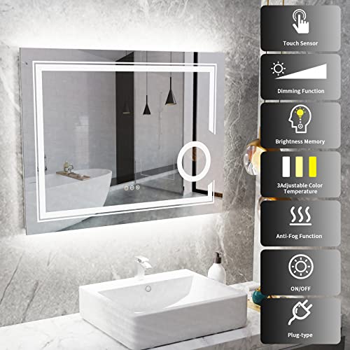 LUVODI Specchio da Bagno con LED Ingranditore: 3X Specchio Bagno Retroilluminato e Frontale Rettangolare - Specchio bagno con Luce Led da Parete da Trucco, Touch, Anti-appannamento 90x70cm