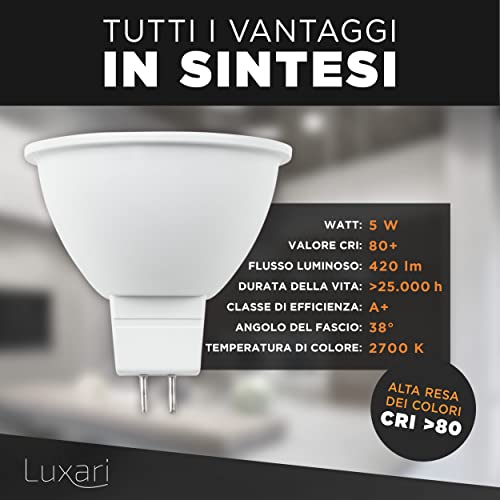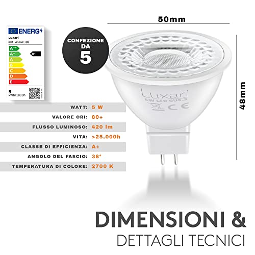 Luxari GU5.3 Lampada LED [5x] - MR16 LED - Equivalente alla lampada alogena 50W - Lampadina LED 5W 420lm - GU 5.3 LED Spot con 2700K bianco caldo [Classe energetica A+]