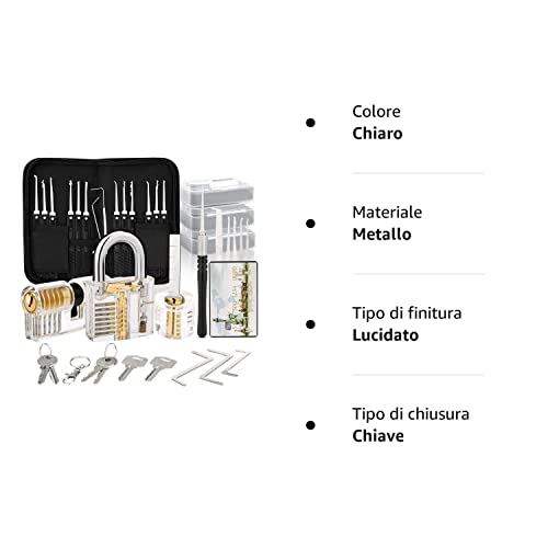 Set di 30 lucchetti Pick composto da Questo kit di serratura contiene tutto ciò di cui hai bisogno per diventare un fabbro professionale. Include 12 perni di bloccaggio, 5 chiavi di serraggio, 3 chiavi di bloccaggio trasparenti, 3 tipi di chiavi e 5 strumenti nascosti come carte di credito, impugnatura intercambiabile, 1 manuale di istruzioni (lingua italiana non )