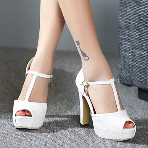 LUXMAX Donna Cinturino a T Scarpe Sandali Plateau Tacco Alto Glitter Sandalo Tacco Largo Tacchi Alti 12 CM (Bianco) - 39 EU
