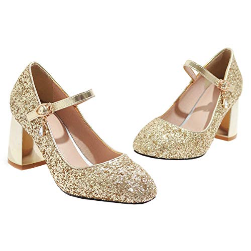 LUXMAX Scarpe Mary Jane Donna Tacco Medio Blocco Decollete Glitter Paillettes da Sposa con Cinturino e Fibbia Eleganti (Oro) - 36 EU