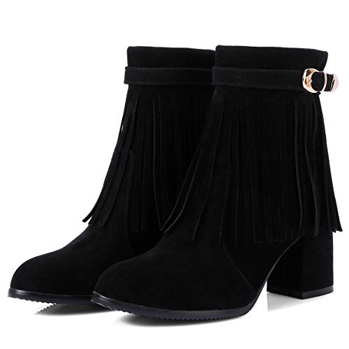 LUXMAX Stivaletti Donna Tacco Alto Grosso Frange Stivali Corti con Cerniera Dietro e Fibbia (Nero) - 46 EU