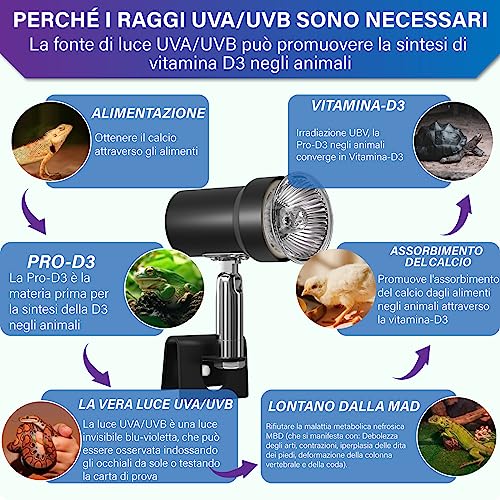 【UVB e UVA】Le lampade riscaldanti per terrari forniscono raggi UVA+UVB e raggi essenziali per i rettili. Può simulare la luce solare in diversi ambienti di riproduzione, i raggi UVA stimolano l'appetito, gli UVB accelerano la sintesi delle vitamine, assorbono completamente il calcio e crescono facilmente.
