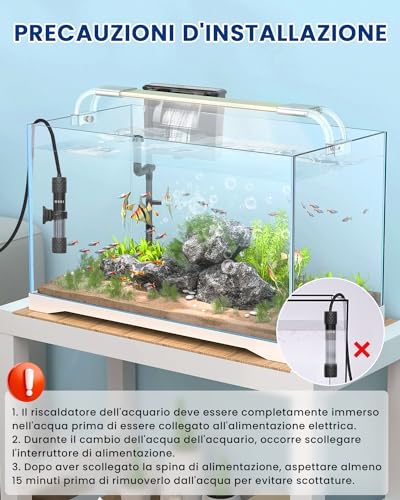 【Dimensione Super Mini, 100W per 50L】Il Mini riscaldatore regolabile per acquari 100W è progettato per acquari con una capacità di 50 litri. Design compatto, occupa meno spazio nell'acquario e può essere facilmente nascosto nel tank. La temperatura può essere regolata con precisione da 64 a 93°F. Questo riscaldatore è adatto per acqua dolce e salata. La tensione nominale è di 220-240V.