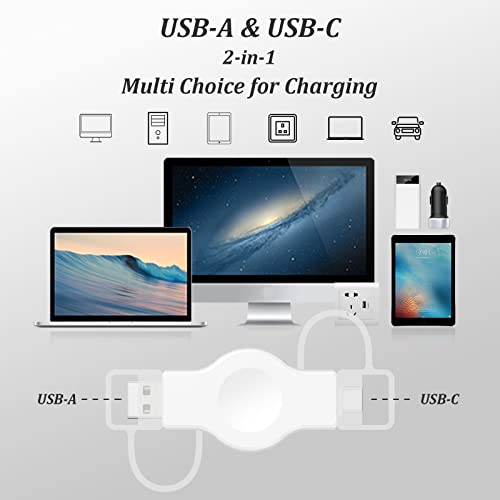 【 2 in 1 Caricatore Wireless per Apple Watch】 Il design di ricarica a doppia interfaccia USB-A e USB-C consente di caricare l'orologio sempre e ovunque. È possibile collegare il caricabatterie a una banca di alimentazione/computer portatile / adattatore da parete/auto o qualsiasi altro dispositivo dotato di una porta di ricarica USB-A o USB-C. Nota: NON power bank.