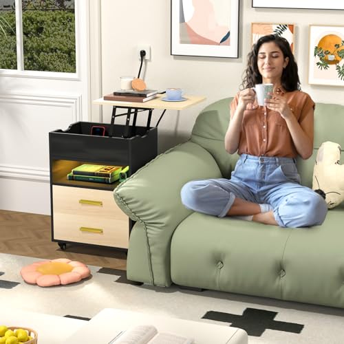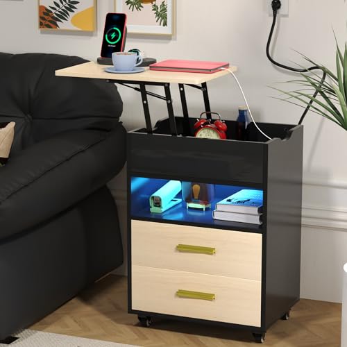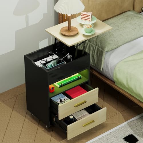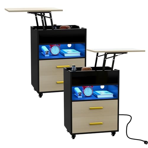 Lvhecforhm 2er Set Comodino Comodino con Piano Sollevabile e Ripiano Aperto, Comodino Mobile con Rotelle, Comodino Con Stazione di Ricarica, Comodino con Illuminazione LED, Comodino con 2 Cassetti