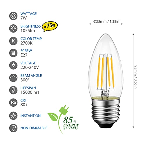Basso Consumo Energetico: La lampadina LED e27 a forma di candela ha un'elevata resa luminosa di 1055 Lumen. Con un basso consumo energetico di 7 Watt, sostituisce 75 Watt. Indice di efficienza energetica dell'UE del 2021 “D”.