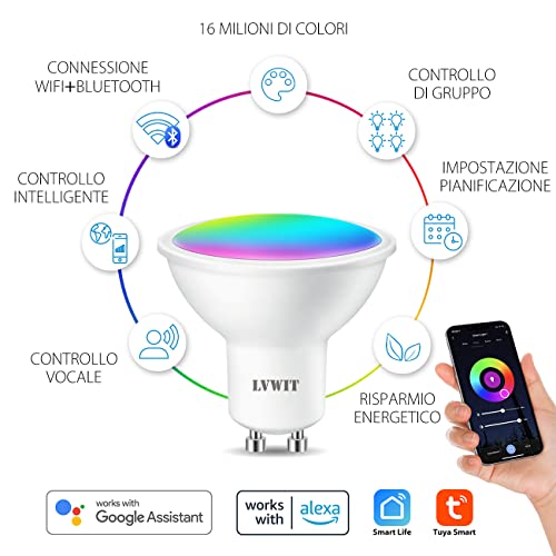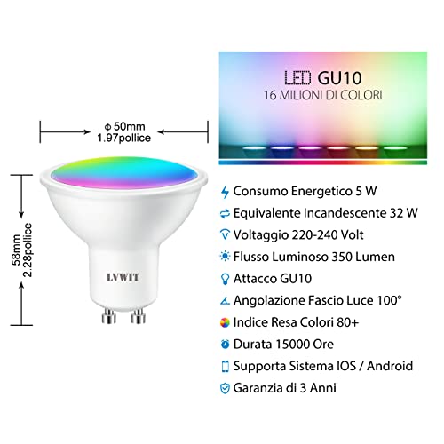 LVWIT Lampadina LED GU10 da Incasso Smart Wifi, 5W Equivalenti a 32W, 350Lm, Compatibile con Alexa, Echo and Google Assistant, RGB Intelligente Dimmerabile, Controllo a Distanza da App