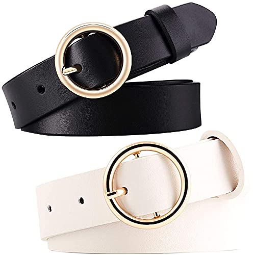LWZko 2 Pezzi Moda Donne Cintura in Pelle, PU Casual Cintura, Cintura in Vita da Donna, Retrò Cintura Jeans con Fibbia Rotonda Classica per Donne, Abiti Ragazza Delle Signore (Nero Bianco)