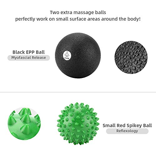 Le due palline da massaggio extra possono lavorare perfettamente su piccole superfici intorno al corpo, in particolare il trattamento di collo, spalle, schiena, petto, glutei, tendini e polpacci, caviglie, inguine e piedi.