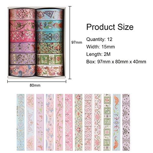 Lychii Washi Tape Set, 12 Rotoli Nastri per Mascheratura con Lamina d'oro, Mastro Decorativo a più Motivi per il fai-da-te, Agende,Scrapbook, Planner