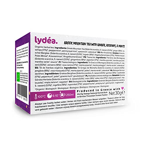 Lydea - Tè greco di montagna bio con zenzero, rosa canina e varietà di menta, 80 bustine piramidali, 4 confezioni da 20 bustine