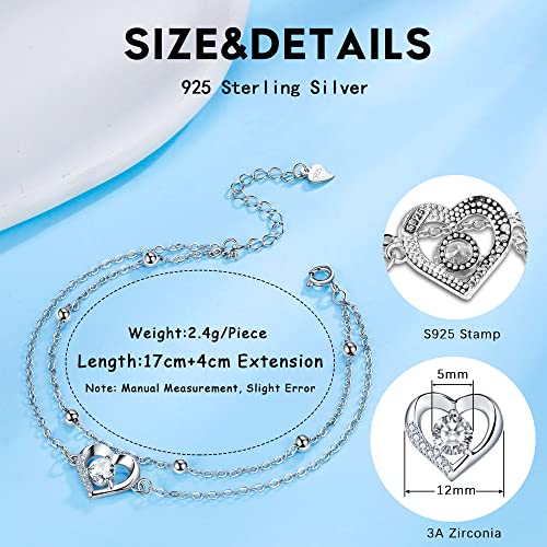 Lydreewam Cuore Bracciale Doppia Donna Argento 925 Bracciale Catena con Perline e Zirconi Compleanno Festa della Mamma Regalo di Natale, Regolabile 17+4cm