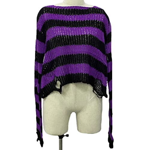 LYWYOUDDKH Maglione a Maniche Lunghe strappato a Righe da Donna Maglieria Corta con Scollo a O Punk - Bianco