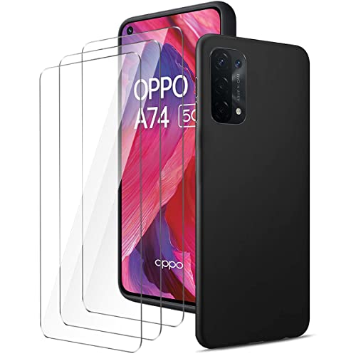 LYZX Cover per Oppo A74 5G (6.50") Nero Custodia + 3 Pezzi Pellicola Protettiva in Vetro Temperato, Ultra Sottile in Silicone Protettivo Bumper TPU Morbido Gel Case