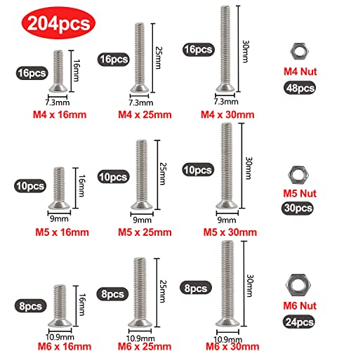【Il Pacchetto Include】Riceverai 204 pezzi di nove dimensioni M4 M5 M6 bulloni e dadi a croce svasati in acciaio inossidabile imballati in una custodia e ci sono tre lunghezze di 16/25/30 mm, sufficienti per soddisfare le tue diverse esigenze.
