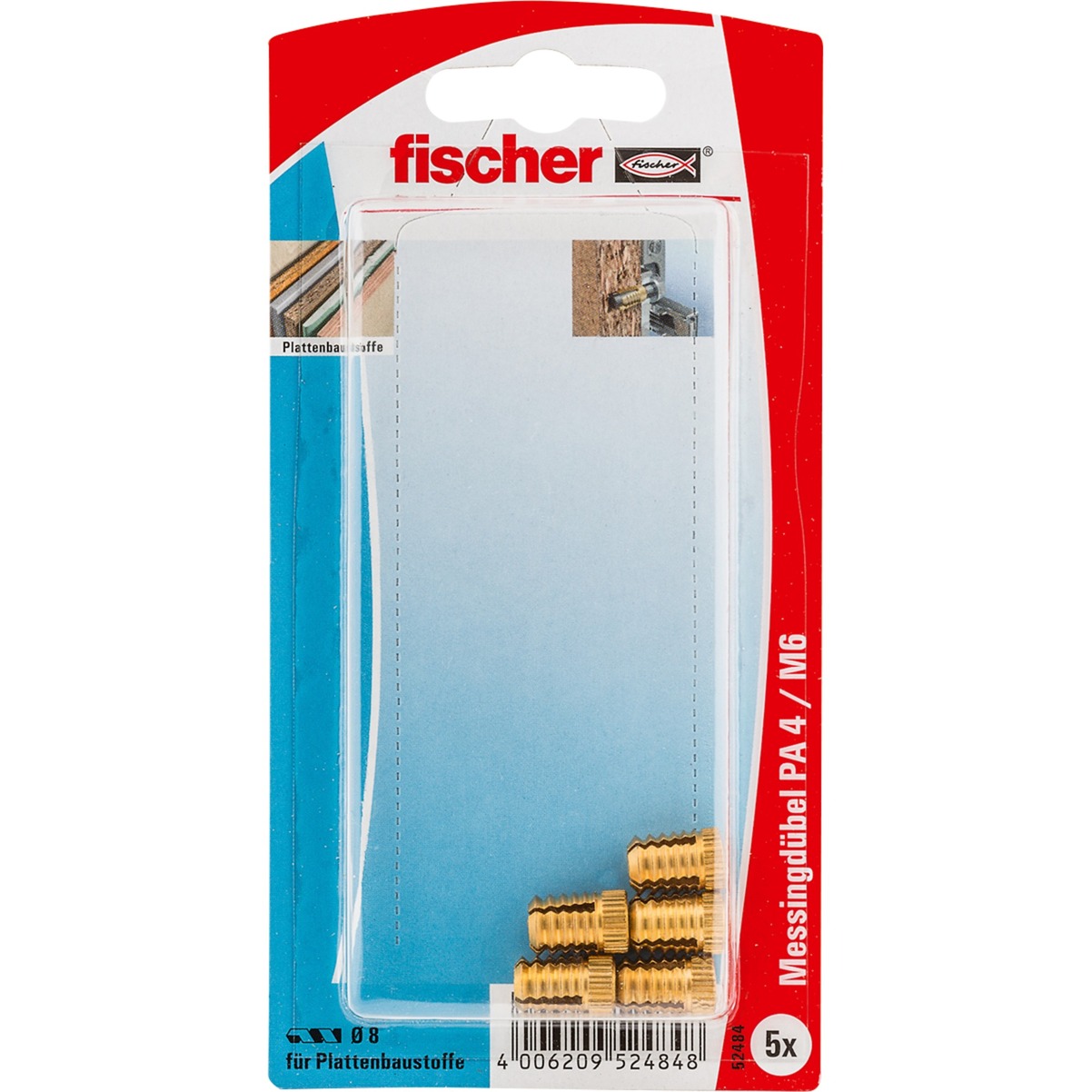 Il tassello in ottone fischer PA 4 M6/13.5 è un tassello spalmabile per il fissaggio di un filo metrico M6 in materiali da costruzione prefabbricati sottili. Il tassello speciale è posto in montaggio pre-spina. Quando si avvita una vite o un''asta filettata, il tassello in ottone si apre e si ancora saldamente contro la parete del foro di trivellazione. La speciale struttura superficiale del tassello in ottone impedisce la rotazione nel foro di trivellazione, il che consente una maggiore affidabilità di montaggio. Il tassello corto in ottone richiede solo una profondità di ancoraggio molto bassa ed è quindi la soluzione ideale per materiali da costruzione prefabbricati sottili. La filettatura interna consente l''utilizzo di viti metriche o aste filettate disponibili in commercio. Il tassello in ottone fischer PA 4 M6/13.5 è adatto ad esempio per il fissaggio di maniglie, staffe o accessori per mobili in materiali a base di pannelli di legno o pannelli di plastica.