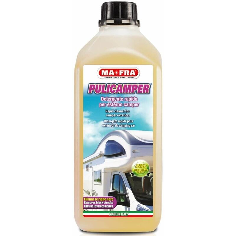 Detergente rapido lavaggio camper Rimuove le antiestetiche righe nere Rimuove ogni genere di sporco difficile Non aggredisce le superfici Descrizione Sai perchè il tuo camper, invece di essere bianco, e ricoperto da strisce nere? L'acqua piovana, che è venuta a contatto con le parti in gomma del tetto e dei finistreni laterali, si è asciugata e ha lasciato delle tracce nere verticali sulla carrozzeria. Per questo Mafra ha ideato e creato Pulicamper, il prodotto ideale per il lavaggio manuale del camper in vetroresina e camper con parti in alluminio. Pulicamper è un detergente particolarmente efficace nel rimuovere le antiestetiche righe nere e le velature. Questa tipologia di sporco ben nota agli amanti del camper, si forma in seguito alla pioggia che, quando viene in contatto con le parti in gomma delle grondaie del tetto, degli oblò e dei finestrini laterali, si asciuga e lascia quelle orribili tracce nere verticali sulla carrozzeria, causate talvolta anche per l'eccessivo caldo.