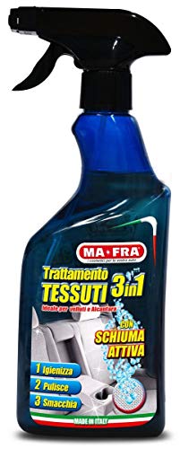 Glass Cleaner e alla sua forza sgrassante, riuscirete a lavare in profondità, sgrassare i vetri, rimuovere gli aloni, le macchie di unto, impronte di dita e ogni altro genere di macchia, è privo di ammoniaca quindi non rischia di rovinare le altre zone della vettura con le quali viene a contatto.Il Trattamento 3in1 Tessuti è la soluzione ideale per la pulizia dei sedili e della tappezzeria della tua auto.