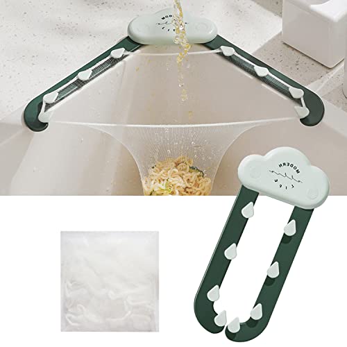 MABAHON Lavello da cucina Triangolo Filtro Tri-Holder Filtro di scarico del lavandino della cucina con uno scaffale pieghevole e 100pcs Filtring Mesh Borse per Cucina Leftover (Verde scuro)