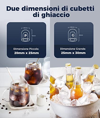 [Funzionamento intelligente, due dimensioni di cubetti di ghiaccio] La macchina ghiaccio ha un design semplice. Vedrai un indicatore quando sia fuori dall'acqua o quando il cestino del ghiaccio sia pieno. La macchina ghiaccio può fare cubetti di ghiaccio di due dimensioni: i cubetti grandi non sono facili da sciogliere e i cubetti piccoli sono ideali per raffreddare le bevande. Puoi scegliere la dimensione dei cubetti di ghiaccio in base alle tue preferenze: bevande/frullati/cibo/frutti di mare.