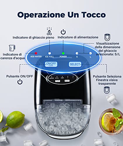 [Funzione autopulente] La macchina ghiaccio con funzione autopulente non richiede pulizia manuale. Basta premere il pulsante di accensione/spegnimento per 5 secondi per avviare la modalità di autopulizia, che ti consente di non perdere tempo a pulirlo. Sarebbe meglio aggiungere una piccola quantità di limonata e soda per la pulizia. (Per mantenere la tua macchina ghiaccio bella e il ghiaccio fresco e gustoso, ti consigliamo di pulire il tuo fabbricatore di ghiaccio una volta alla settimana).