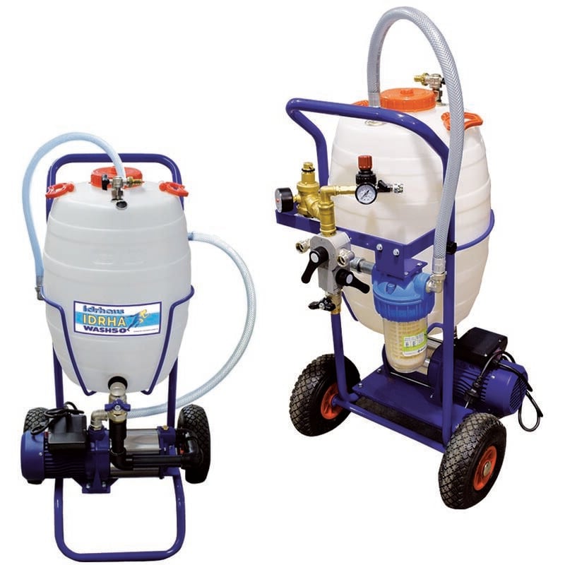 Ideale per il lavaggio e la pulizia e la sanificazione degli impianti di riscaldamento tradizionali e a pavimento. Permette il riempimento e la disaerazione anche di impianti solari termici alla temperatura max di utilizzo di 60°. Dotata di pompa centrifuga multistadio, invertitore di flusso, valvola deviatrice, rubinetto di scarico e di un kit monoblocco con due riduttori di pressione (uno per l'acqua e uno per l'aria ), un filtro per le impurità e valvola a tre vie per il lavaggio tradizionale e il lavaggio con sistema flussato con aria mediante compressore (non in dotazione). Serbatoio della pompa asportabile. CARATTERISTICHE: Portata: 70 lt/min Pressione: 0,5 ÷ 5,5 bar Capienza: 50 lt Tensione di rete: 220V - 50 Hz Potenza motore: 900 W Alimentazione: 220V - 50 Hz Temperatura esercizio con liquido: 60°C Peso: 35 kg DOTAZIONE: 2 tubi retinati Ø 25 da 3 m raccordati con girello da 3/4 2 tubi retinati Ø 25 da 0,60 m raccordati con girello da 3/4 1 tubo retinato Ø da 3 m Custodia