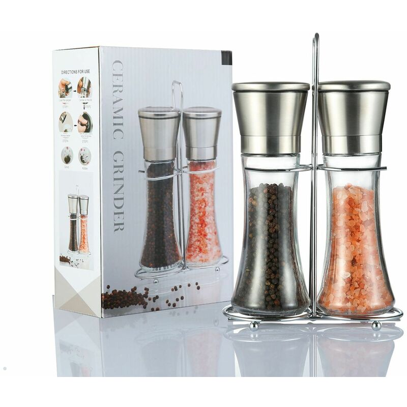 Smerigliatrice di alta qualità (confezione da 2) - La copertura in acciaio inossidabile 304 garantisce una lunga durata. Macinapepe in ceramica con spessore regolabile e design elegante e moderno, ideale per tavoli da cucina o da pranzo. Ceramica regolabile - Il nostro macinapepe e sale ha un macinino continuo in ceramica, che ti consente di scegliere la ruvidità che desideri, adatto per sale marino, pepe nero, sale himalayano, spezie, ecc. Mantiene le spezie fresche e prive di polvere: gli agitatori di sale e pepe non sono corrosivi e non assorbono il sapore e l'acciaio inossidabile il coperchio tiene fuori l'umidità e la polvere. Macinapepe con supporto - Macinapepe Macinasale mantiene il bancone pulito e ordinato. Macinapepe facile da usare e da ricaricare: basta svitare il coperchio del macinino, versare le spezie nel corpo in vetro, quindi regolare l'anima nel coperchio per regolare la ruvidità e chiudere il coperchio in senso orario.