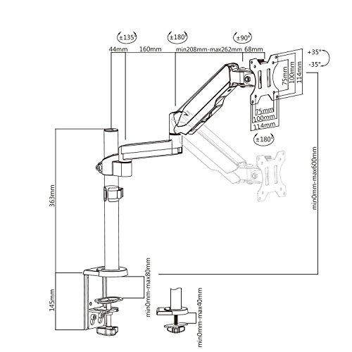 Carico massimo: fino a 8 kg - Inclinazione regolabile da -35 a +35 gradi - Distanza orizzontale massima: 100 mm - Distanza verticale massima: 100 mm - Materiale: alluminio pressofuso + acciaio - Ha un sistema di chiusura altezza - Passacavo - Altissima qualità - Progettato per monitor da 17 "- 327" (o più grande se il loro peso non supera gli 8 kg e lo standard VESA è compatibile con l'impugnatura) - Verniciatura a polvere - Molla a gas - Include un set di viti di montagg