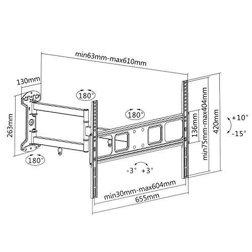 Le dimensioni dello schermo fornite sono solo un suggerimento. Un televisore più grande può essere montato sul supporto quando non supera il peso massimo e si trova nello standard VESA specificato. Possiamo facilmente collegare il display VESA al supporto: 75x75, 100x100, 200x100, 200x200, 200x300, 300x300, 300x400, 400x400, 600x300, 600x400. Un set completo include una serie di viti per il montaggio del supporto da parete.