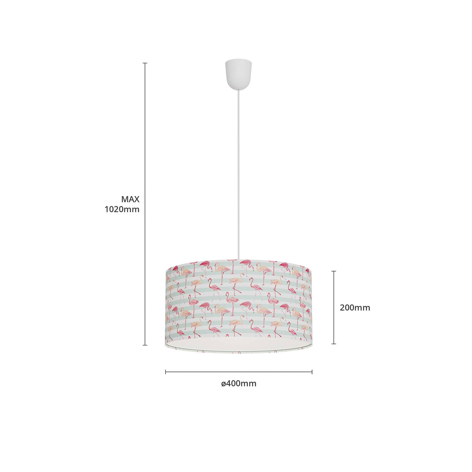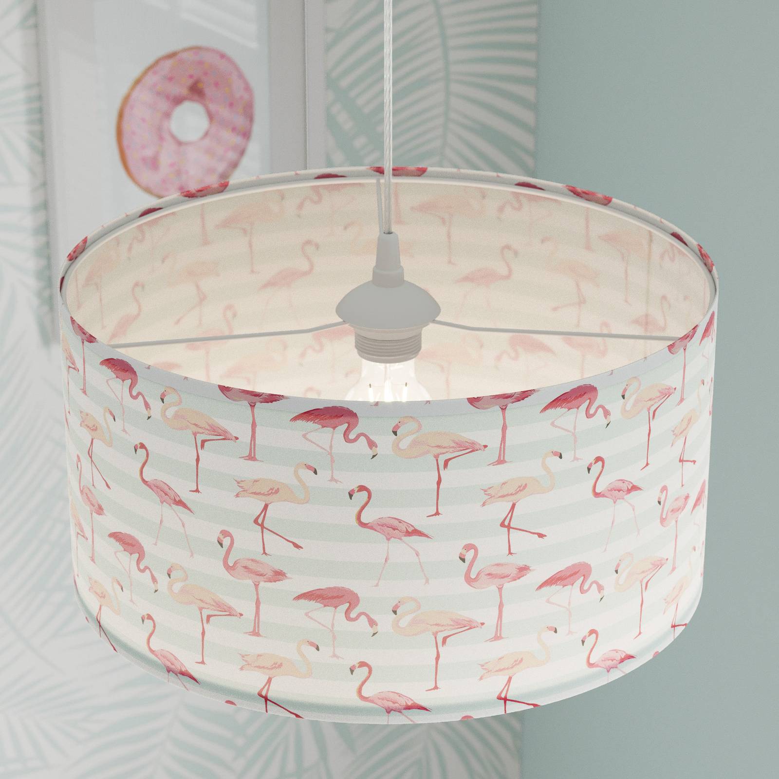 Lampada a sospensione Miami colorata con stampa di fenicotteri Il paralume rotondo della lampada a sospensione Miami presenta un motivo colorato che garantisce il buon umore. Lo sfondo del motivo è a strisce blu e bianche, ma l'attenzione principale è rivolta ai Flamingo, che si presentano in tonalità colorate di arancione e rosa. La lampada a sospensione Miami può essere utilizzata in cucina, in camera da letto o in corridoio. Non ci sono limiti alle possibilità, ma ovunque sia installata la Lamp crea un flair rilassante. La lampada a sospensione Miami può essere installata anche negli uffici, per alleggerire l'atmosfera e creare un'illuminazione generale. Die si inserisce sempre in un ambiente accogliente e luminoso.
