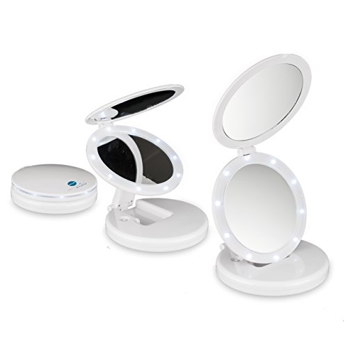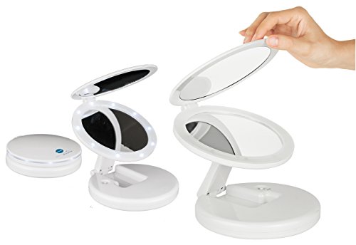 Doppio specchio con lato ingrandente e lato normale, pieghevole, con luce a led, funziona con 4 batterie AA incluse.